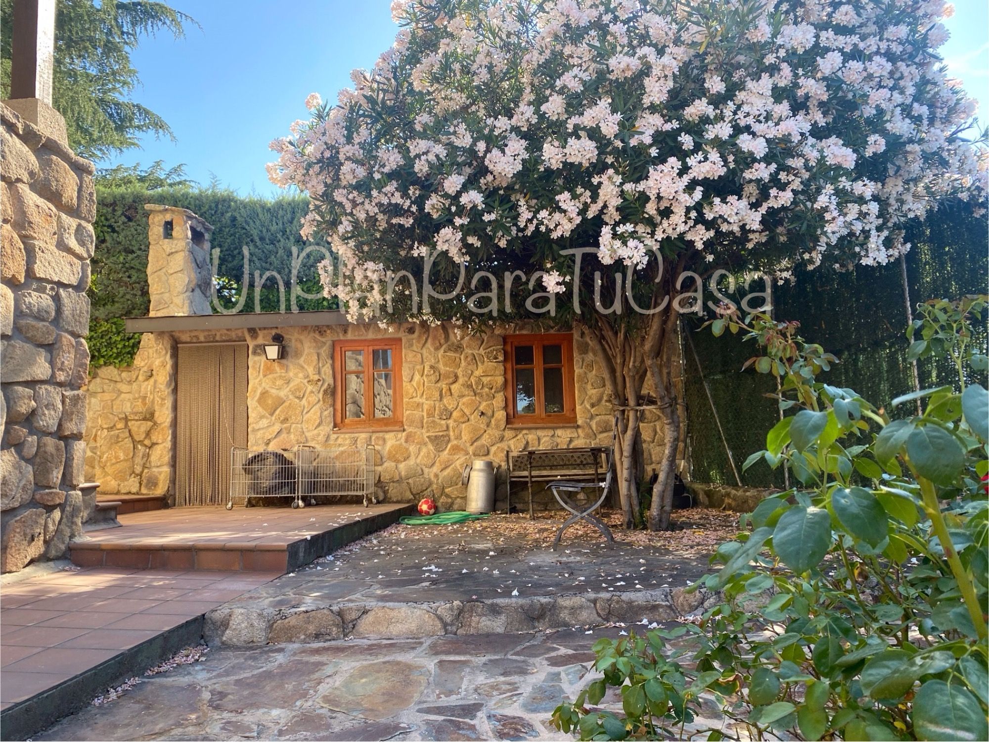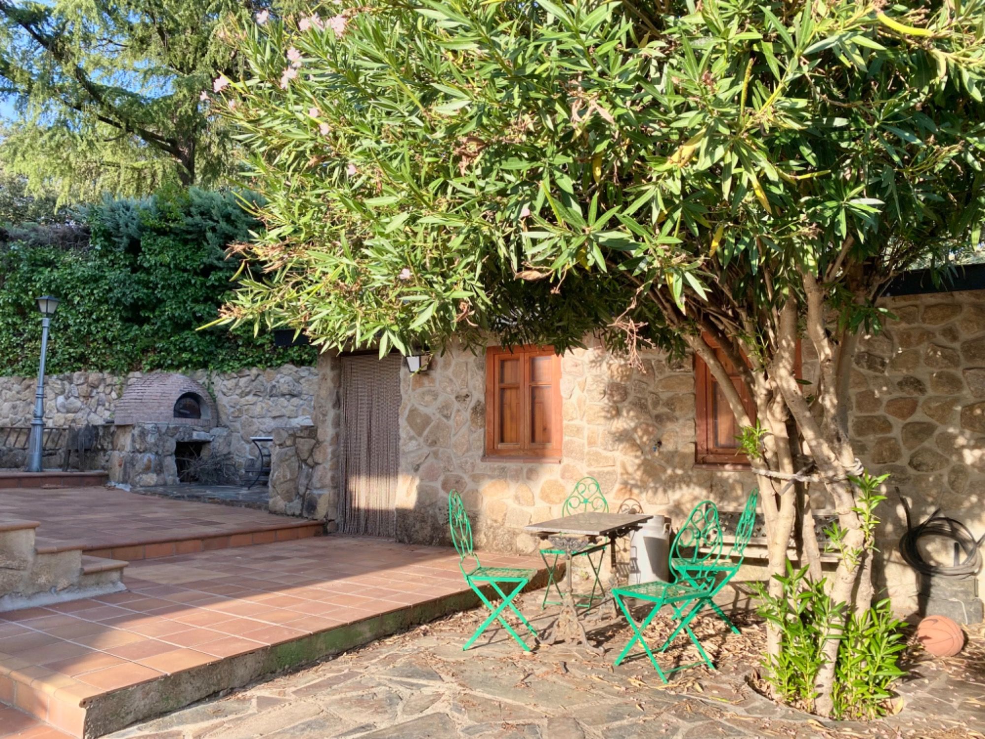El jardín consolidado con luces perimetrales y riego automático tiene una bonita arboleda. Dispone de una fantástica piscina, dos casetas una de herramientas y otra de apoyo a la piscina, zona de barbacoa y horno de leña tradicional de ladrillo para disfrutar con familia y amigos.